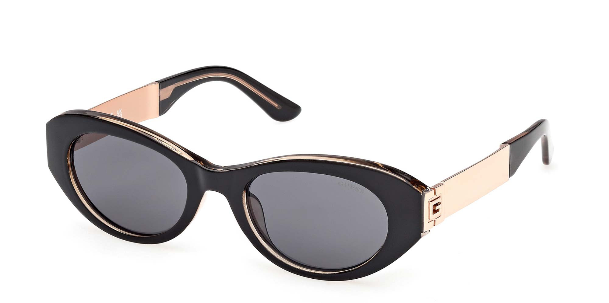 Injected front style sunglasses, with a trendy and young design. Iconic square G logo on bold metal temple. Colored plastic temple tips. Potential ADV style.