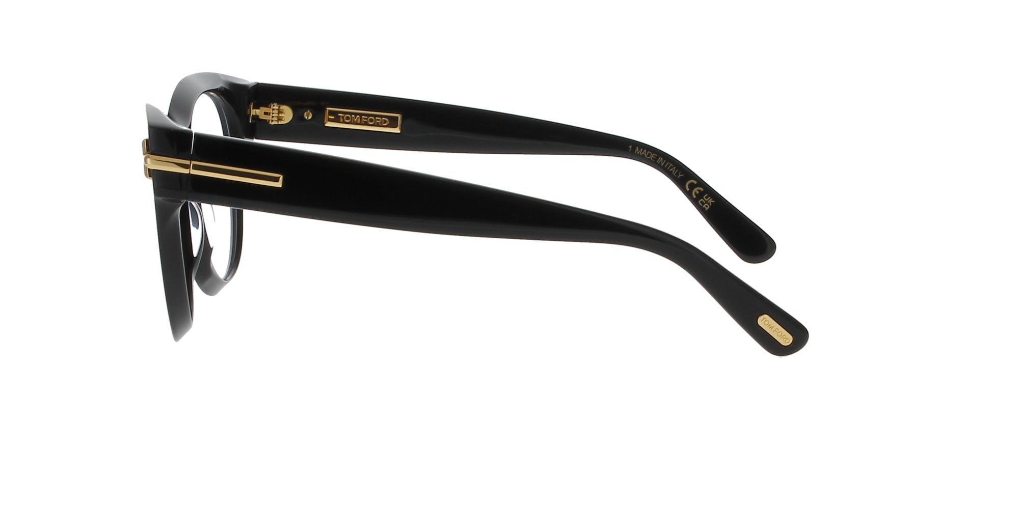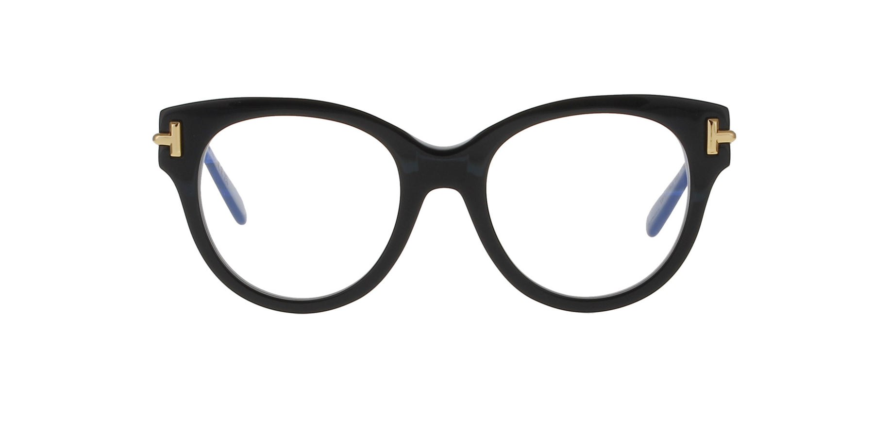 Featuring a round, shiny black frame with the signature 'T' logo on the temple hinges