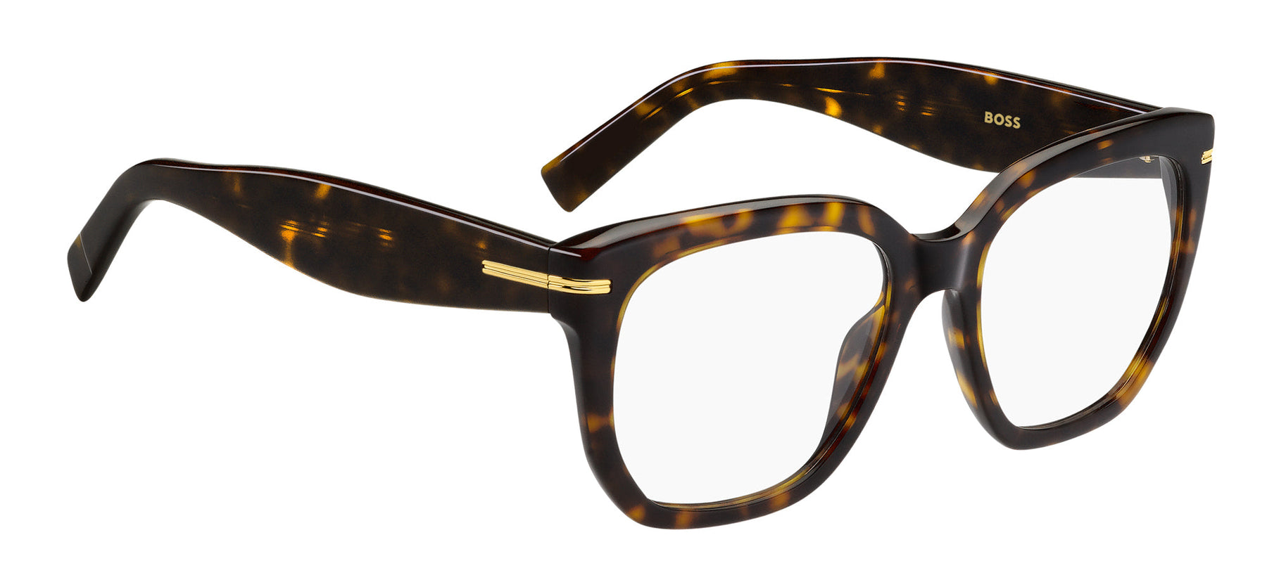 It's hard to resist the allure of these women’s eyeglasses by BOSS. Their bold proportions steal the show, and their intense colour palette is just as cool thanks to bonded acetate inserts which are either on-tone or playfully juxtaposed with the rest of the temple. The eco-acetate structure is made from renewable and recycled resources, a symbol of courageous and sustainable fashion. The metal detail shaped into the three BOSS stripes adds the final touch.