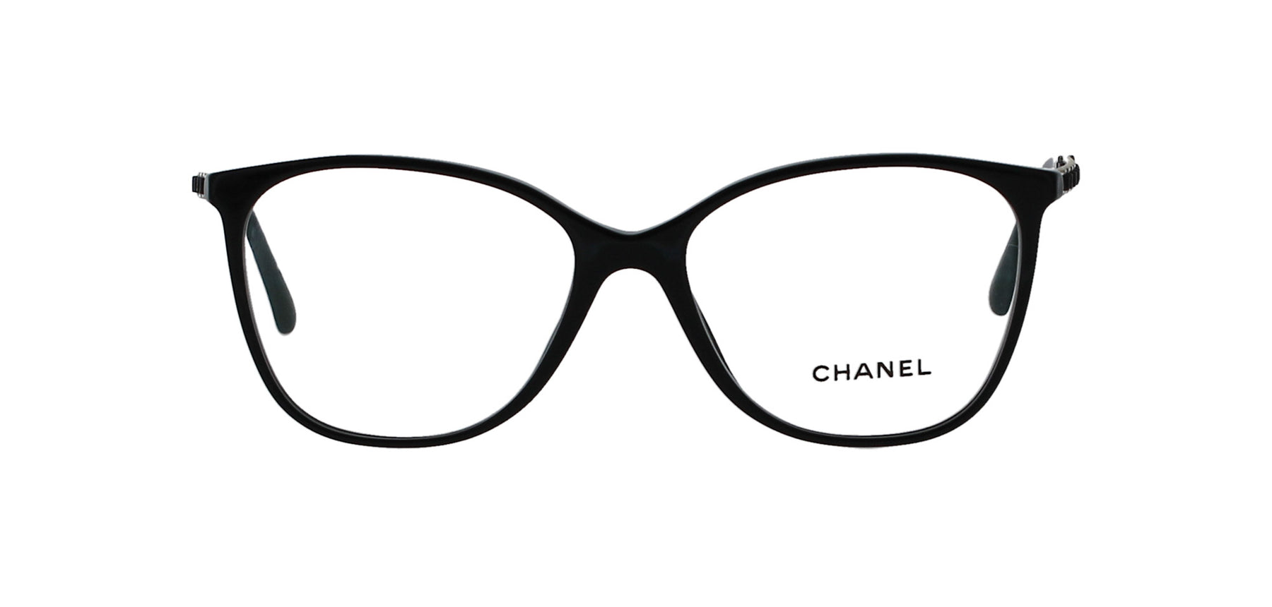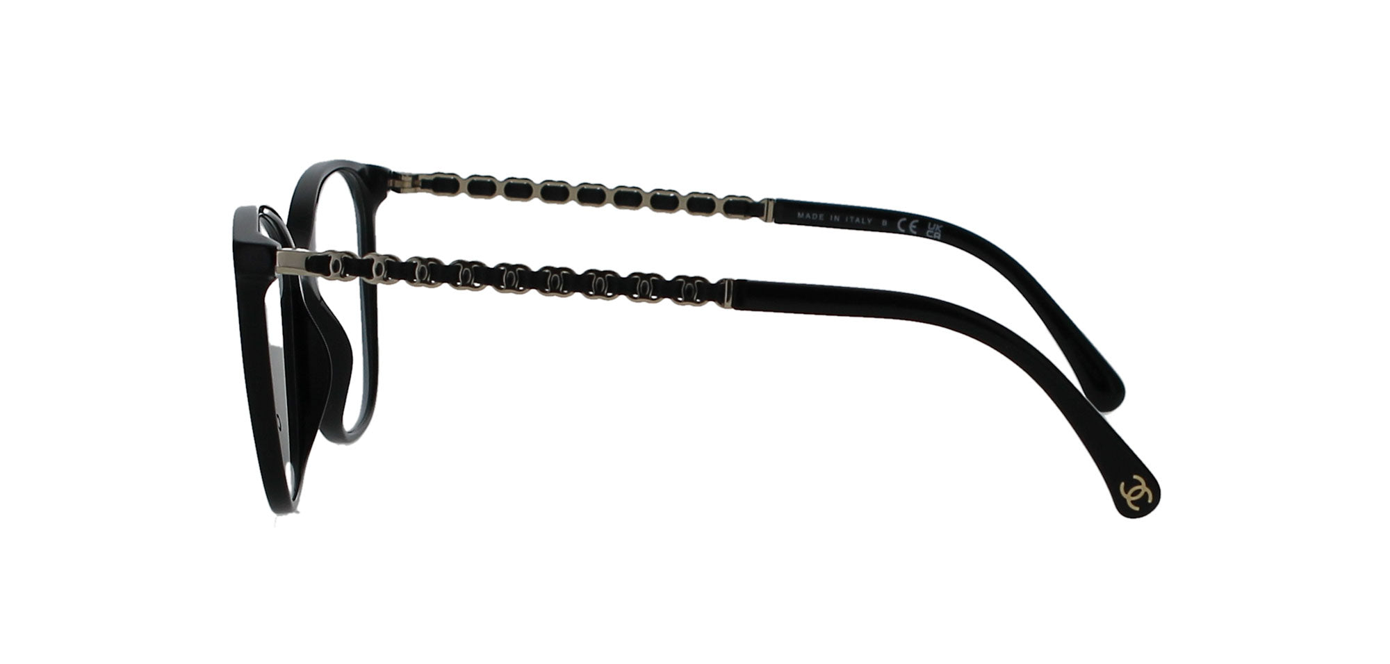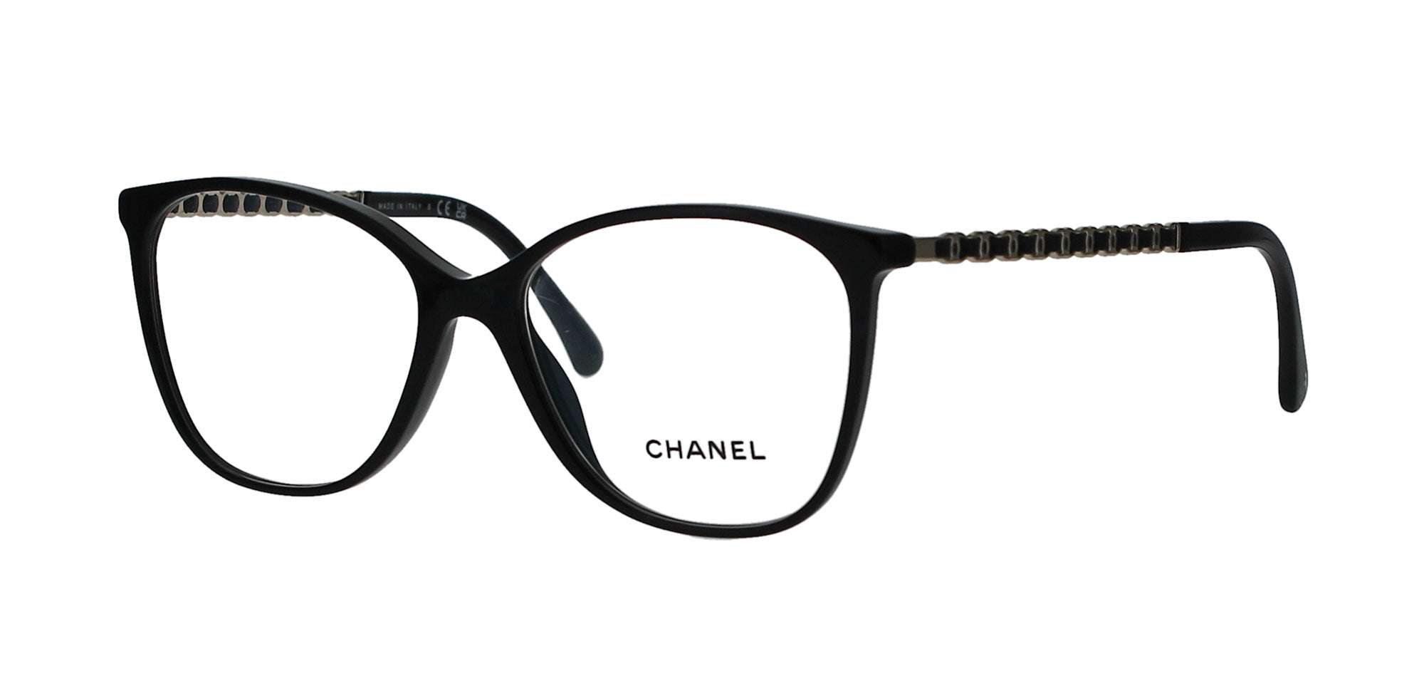 Features a square, shiny black frame with chain-style logo imbedded temples