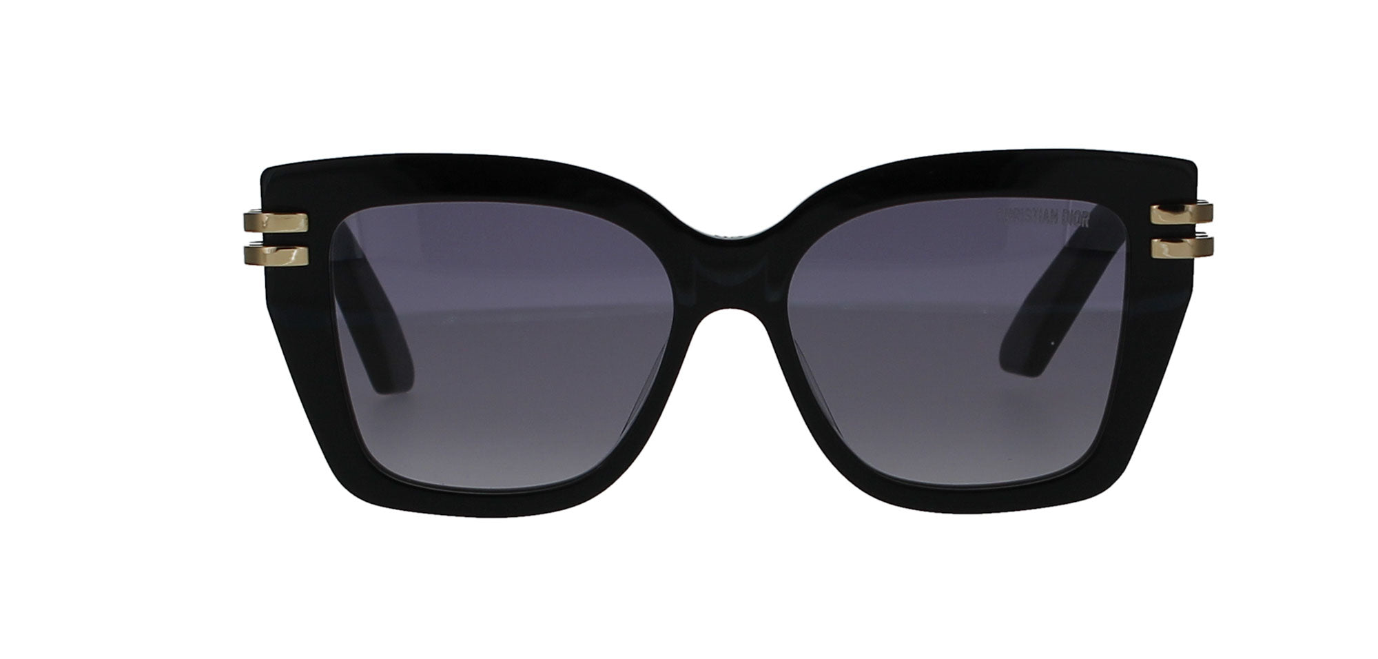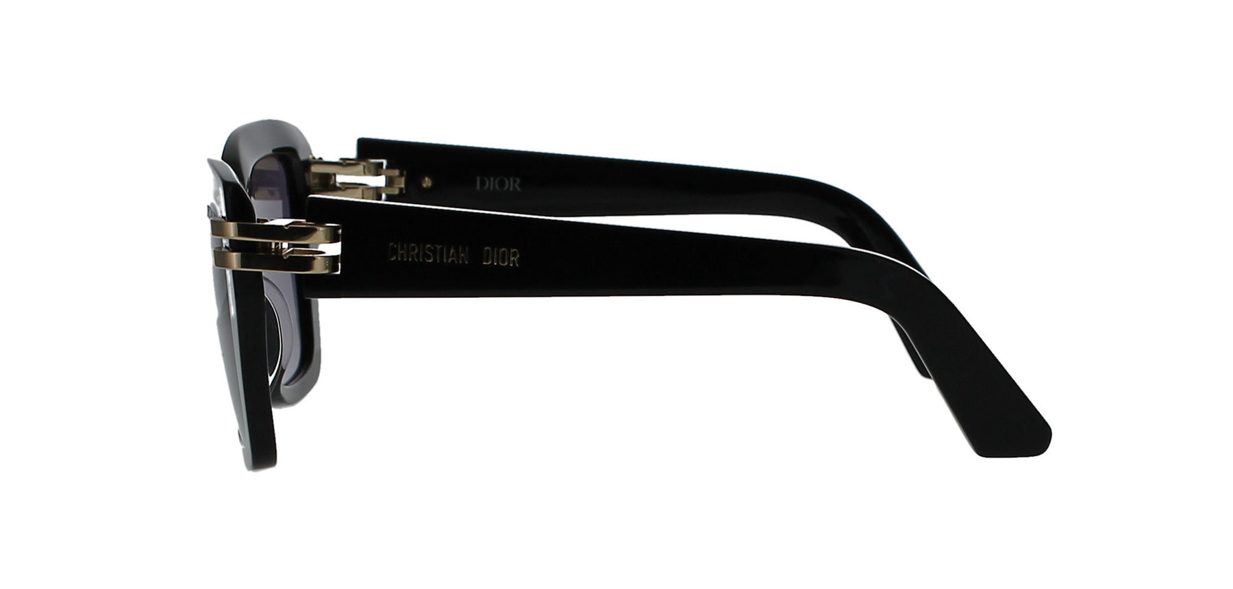 Features a square, shiny black frame with gold hinges and trademark 'CHRISTIAN DIOR' logos on each temple