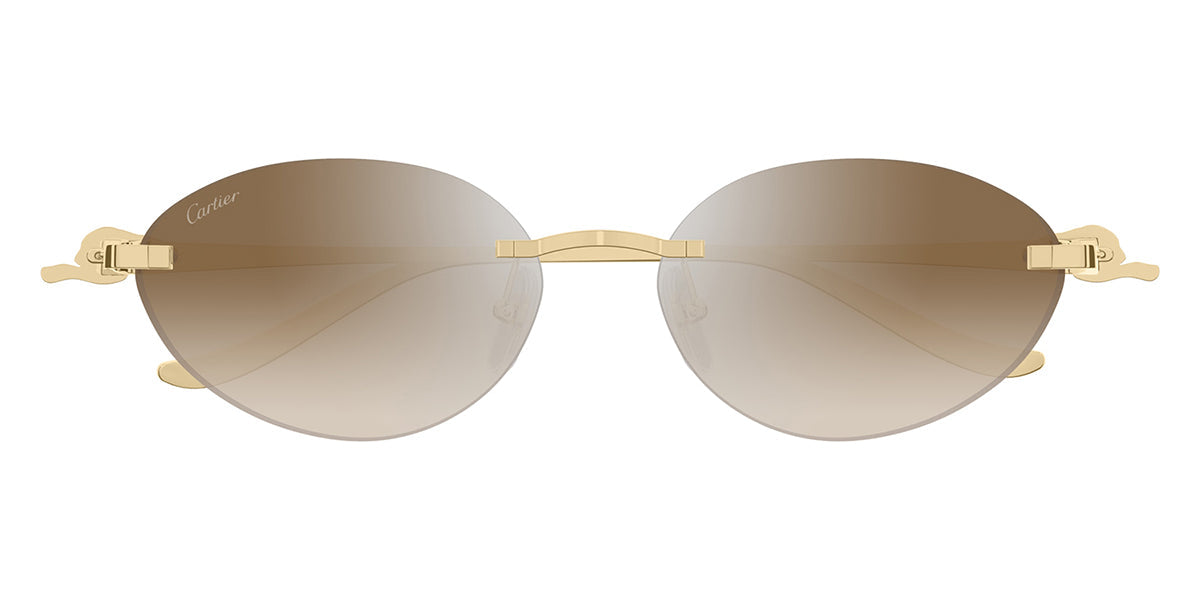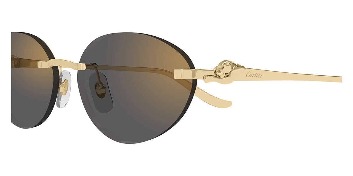Re-vamped bi-dimensional Panthère fully in metal with the Panthère body running along all the temple. Feminine and contemporary soft cat eye shape in rimless construction for a sophisticated yet iconic look. Hinge embellished by the iconic Panthère silhouette designed in every details. Precious finish in gold paired with colourful lenses and Double C Décor on the nose pads.