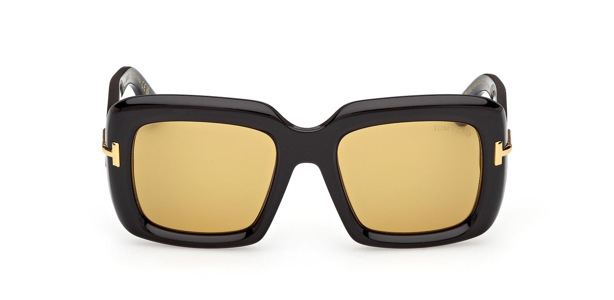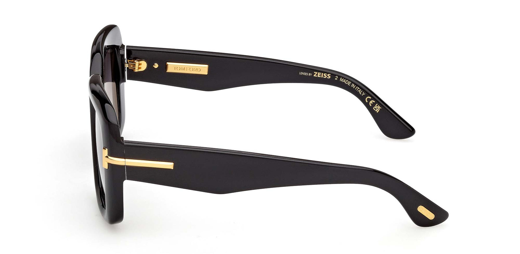 Sculpted squared style, with architectural influences. A 70s shape brought to nowadays, characterized by the 3-D T logo on front and temples. Tom Ford signature temple plates, yellow gold colour details and Zeiss lenses.