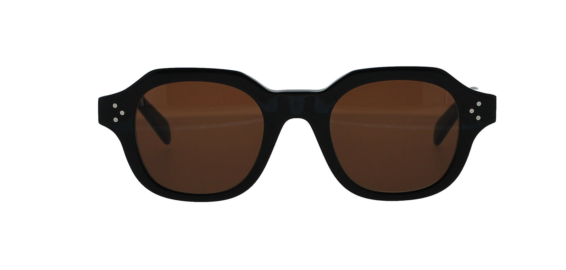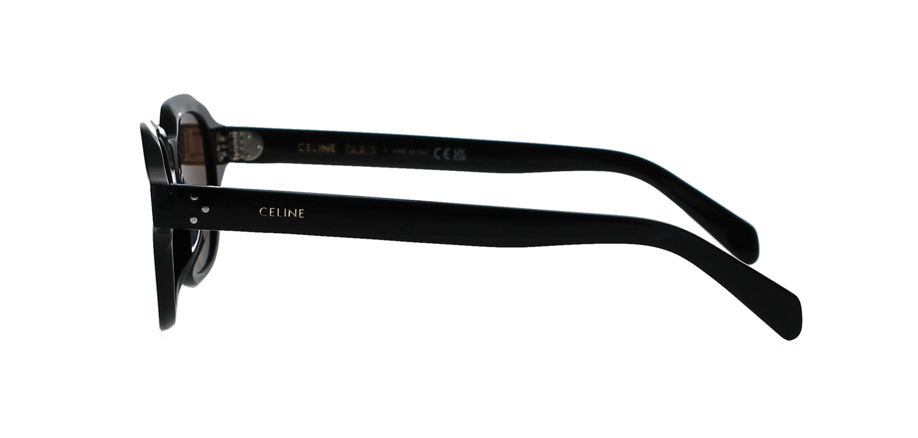Features a square, black acetate frame with gold 'CELINE' logos on each temple